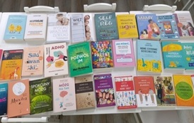 Na zdjęciach widać wiele książek, które tłumaczą rozwój mózgu dziecka i to, jak przekłada się to na jego zachowanie.